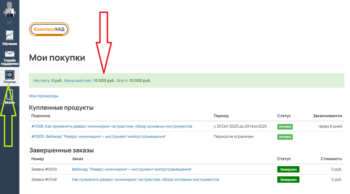 5. Размер скидки отобразится в вашем личном кабинете. Смотрите бонусный счёт в разделе «Покупки»